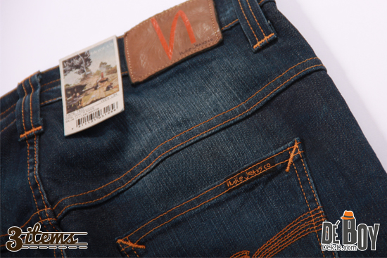 มีกิมมิกเป็นเอกลักษณ์ ตรงกระดุม และหมุด เขียนว่า 'Nudie Jeans Co'