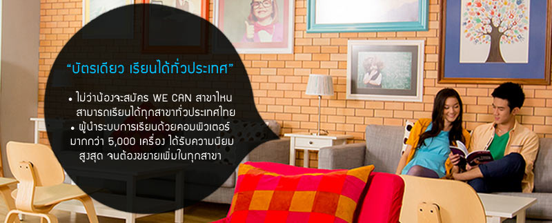 WE CAN ระบบการเรียนส่วนตัวสุดล้ำ ที่น้องสามารถเลือกบทเรียนและเวลาเรียนเองได้ หยุดจด ย้อนทวนซ้ำได้เมื่อต้องการ ทำให้ไม่พลาดในทุกการเรียนรู้ และเหนือกว่าระบบการเรียนส่วนตัวทั่วไปด้วย “WE Cloud” นวัตกรรมการเรียน (Education Innovation) ซึ่งเราได้พัฒนาขึ้นด้วยเทคโนโลยี Cloud Computing และออกแบบการใช้ด้วย HTML5 บนหลักการ Open Source สถาปัตยกรรมของ We Cloud ถูกออกแบบเพื่อความสะดวก สบาย ต่อน้องๆนักเรียนของเราในทุกขั้นตอนของการเรียนแบบ WE CAN น้องๆสามารถกำหนดเวลาเรียน และยกเลิกเวลาเรียนเองได้ ผ่าน Facebook อยู่ที่ไหนก็วางแผนการเรียนได้ผ่านมือถือ Smart Phone ด้วย WE App ทั้ง iPhone iPad Android และ Windows Phone บัตรเดียวเรียนได้ทั่วประเทศ เรียนข้ามสาขาได้ เพราะระบบ WE CAN เชื่อมโยงถึงกันทั้ง 29 สาขา ด้วย WE Virtual ทำให้การเรียนไม่มีสะดุด หรือหยุดทำงาน และปลอดภัยจากไวรัสคอมพิวเตอร์ นี่คือแนวทางของการศึกษาแห่งอนาคต ที่เรามุ่งมั่นพัฒนาคุณภาพการเรียนการสอนอย่างไม่หยุดยั้งเคียงคู่ไปกับภาคการศึกษาของประเทศ ดังปณิธานที่ตั้งมั่นของเรา