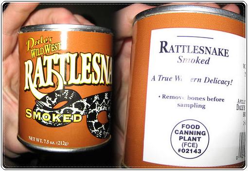 มีระบุชนิดของงูด้วย ธรรมดาแค่เป็นเนื้องูปรุงสุกเสิร์ฟเป็นเมนูอยู่บนโต๊ะก็ว่าสยองแล้ว อันนี้เดาว่าถ้าเอาออกจากกระป๋องน่าจะมาเป็นตัวยาวๆ แน่เลย จ้างให้ก็ไม่กินแน่ๆ 555