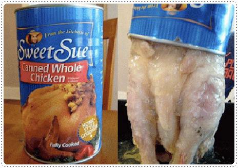 ลูกชิ้นกระป๋องว่าสะดวกแล้ว แต่อันนี้คือขั้นสุดยอดของความสะดวกค่ะ เป็นไก่ประป๋องที่ยัดลงมาทั้งตัวเลย ถือว่าเป็นไอเดียที่ดีที่ช่วยยืดอายุของอาหารให้อยู่ได้นานขึ้น ปกติไก่ต้มอยู่สองสามวัน(แบบไม่แช่เย็น) ก็เริ่มกลิ่นไม่ดีแล้วค่ะ นี่ถ้ามีในประเทศไทยจริงๆ พี่มิ้นท์ว่าน่าจะขายดี โดยเฉพาะเทศกาลตรุษจีน^^