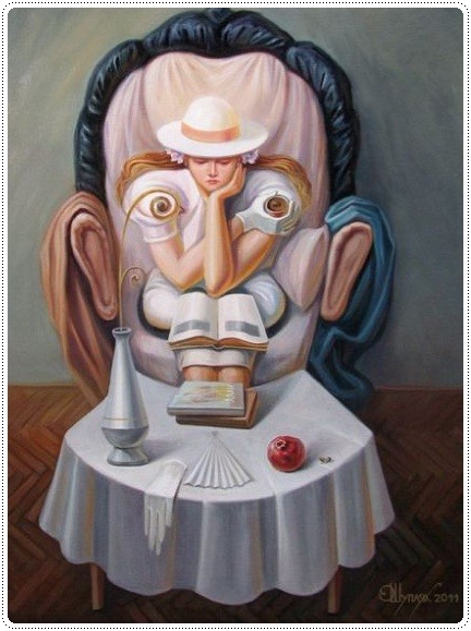ในรูปนี้มีโซฟา มีผู้หญิง มีผ้าปูโต๊ะ แต่พอดูรวมๆ แล้วกลายเป็นหน้าคน