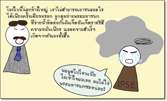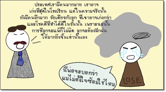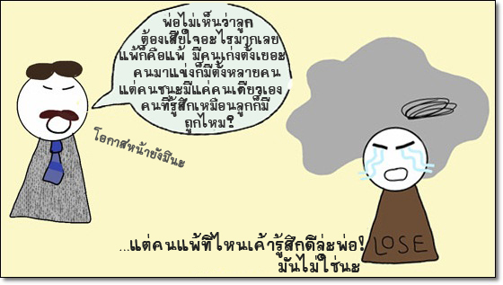 ต่อให้ลูกฟังแล้วรู้สึกว่าพ่อมองโลกแง่ดี แถมยังไม่ว่าที่ตัวเองแพ้ด้วย แต่ในความเป็นจริง ต่อให้มีคนแข่งถึง 1000 แล้ว แล้วต้องหนึ่งใน 999 คนที่แพ้ ไม่ว่าใครก็รู้สึกว่าแพ้ ไม่มีแพ้มากหรือแพ้น้อยหรอกค่ะ ไม่ใช่โรคภัยไข้เจ็บเล็กน้อย แค่พักผ่อนก็หายเสียหน่อยใช่ไหมคะ