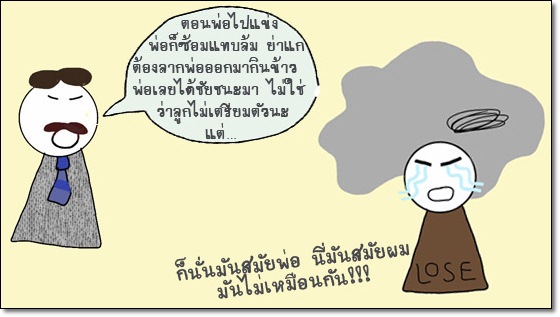 ถ้าลูกที่เพิ่งแข่งแพ้มาเจอพ่อพูดแบบนี้ ร้อยทั้งร้อยยิ่งไม่พอใจคำพูดของพ่อหนักไปกว่าเดิม ไม่ใช่ว่าพ่อพูดผิด แต่เพราะกลับไปตอกย้ำความพ่ายแพ้ของลูกโดยไม่รู้ตัว และที่สำคัญไม่ใช่ว่าลูกไม่รู้ตัว ว่าน่าจะแพ้เพราะอะไร แต่ถ้าฟังสำนวนพ่อแล้วตีความผิดไป เขาก็จะพาลคิดไปว่าพ่อกำลังซ้ำเติม และหาว่าตัวเค้าทำผิดแต่ต้นแล้ว ซึ่งจริงๆ ข้อเท็จจริงเหล่านี้ จริงๆ ลูกวัยรุ่นก็รู้ตัวอยู่แล้วค่ะ (หรืออย่างน้อยก็รู้หลังจากทำใจได้) ไม่ต้องพูดย้ำตอนที่เพิ่งเสียใจก็ได้