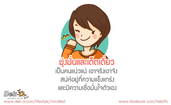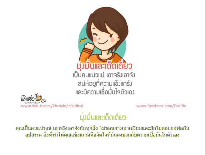 ผลลัพธ์ตรงกับนิสัยของน้องๆ ชาว Dek-D.com กันบ้างหรือเปล่า กระซิบสักนิดว่าลองเอาไปถามเพื่อนหรือคนใกล้ตัวกันนะจ๊ะ เผื่อจะได้รู้จักนิสัยกันมากขึ้น แล้วอย่าลืมเอาคำตอบมาบอกกันบ้างนะจ๊ะ บ๊ายบาย