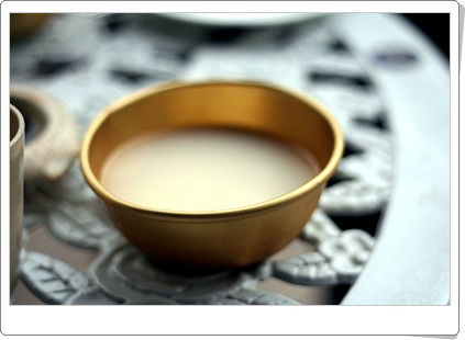 Korea Rice Wine ค่ะ เวลาดื่มจะนิยมดื่มโดยใส่ถ้วยสีทองเหลืองแบบในภาพค่ะ