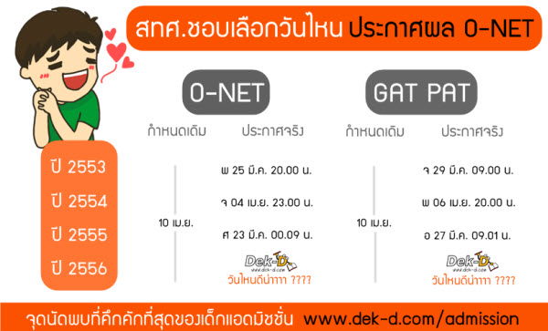 สวัสดีครับ ใกล้เข้ามาแล้วสำหรับ การประกาศผลคะแนน O-NET 2555 และ GAT PAT มี.ค.56 โดยตามกำหนดเดิมคือวันพุธที่ 10 เม.ย.56 แต่จากการลำดับเรื่องราวข่าวต่างๆ ฟันธงครับว่า ทั้ง O-NET และ GAT PAT ประกาศก่อนกำหนดแน่นอน ซึ่งคะแนนส่วนไหน จะประกาศวันไหน ตอนนี้ยังไม่มีใครรู้ แต่ที่น้องๆ ควรรู้ไว้ก่อนเลยคือ "ช่องทางในการเช็คผล" ซึ่งเป็นช่องทางเดิมเหมือนกับการลุ้นผลตอบที่ผ่านมานั้นเอง