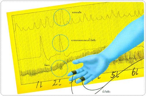 นอกจากนี้ความเครียดมีผลทำให้เส้นเลือดหดตัว ทำให้ความดันโลหิตและอัตราชีพจรสูงขึ้น ทำให้กราฟคลื่นชีพจร ซึ่งเป็นกราฟเส้นที่ 3 (ล่างสุด) สูงขึ้นนั่นเอง