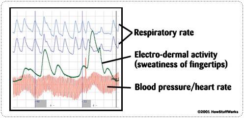 เชื่อได้ว่าการถูกกดดันจากคำถามและสภาพแวดล้อมที่ดูดุดันแบบนี้ ทำให้เกิดความเครียด ยิ่งถ้าต้องโกหกท่ามกลางบรรยากาศแบบนี้ยิ่งเครียดขึ้นหลายเท่า เมื่อมีการโกหกขึ้น ขั้วไฟฟ้าของเครื่องนี้จะตรวจจับสัญญาณผิดปกติได้ คราวนี้มาดูกันต่อว่าผลที่ออกมาฟ้องอะไรเราได้บ้าง