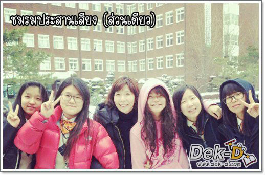 อีกเรื่องนึงคือ หู้เลือกอยู่ชมรมประสานเสียง เพราะว่าหู้ชอบร้องเพลงแล้วก็เต้นเป็นที่สุด ชมรมนี่ไม่จำเป็นต้องใช้ทักษะภาษาเกาหลีมาก (ตอนไปใหม่ๆ หูดับมากค่ะ) แล้วหู้อยู่ระดับเสียง