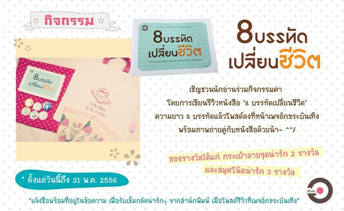 สำนักพิมพ์อักขระบันเทิง ขอเชิญชวนผู้ที่สนใจร่วมกิจกรรมเขียนบทรีวิวหนังสือ 8 บรรทัดเปลี่ยนชีวิต ความยาวแปด (8) บรรทัด ไม่ขาดไม่เกิน เสร็จแล้วให้โพสต์ลงเพจ "อักขระบันเทิง" ในเฟซบุ๊ค พร้อมกับรูปถ่ายตัวเองคู่กับหนังสือ 8 บรรทัดเปลี่ยนชีวิต