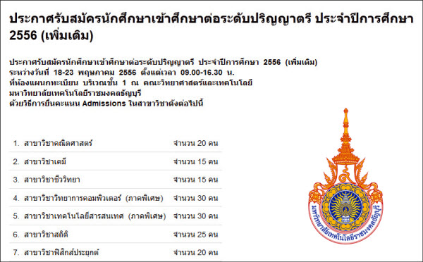 เปิดรับสมัครระหว่าง 18-23 พฤษภาคม 2556 ตั้งแต่เวลา 09.00-16.30 น.ที่ห้องแผนกทะเบียน บริเวณชั้น 1 ณ คณะวิทยาศาสตร์และเทคโนโลยี มหาวิทยาลัยเทคโนโลยีราชมงคลธัญบุรี ด้วยวิธีการยื่นคะแนน Admission