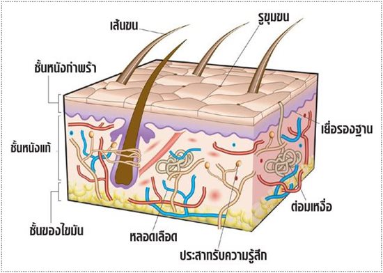 ชั้นถัดมาคือชั้นหนังแท้(ชั้นเดอมิส) เป็นชั้นสำคัญของผิวหนังประกอบไปด้วยส่วนที่เป็นเส้นใย เช่น คอลลาเจน ไฟเบอร์ อีลาสติค ซึ่งทั้งหมดเป็นเส้นใยที่ทำให้ผิวหนังมีความยืนหยุ่น แข็งแรง และช่วยซ่อมแซมผิว นอกจากนี้ในชั้นหนังแท้ยังมีเส้นเลือด กล้ามเนื้อ เส้นประสาทรับความรู้สึกต่างๆ เช่น รับความรู้สึกร้อน เย็น เป็นต้น ผิวชั้นหนังแท้นี่แหละค่ะที่เกี่ยวข้องกับการเกิดริ้วรอยโดยตรง เมื่ออายุมากขึ้นชั้นหนังแท้จะบางลง คอลลาเจนและอิลาสตินก็จะเสื่อมลง ผิวก็ไม่ยืดหยุ่นเหมือนเดิมนั่นเอง ส่วนชั้นสุดท้ายคือชั้นไขมัน ประกอบไปด้วยเซลล์ไขมัน เส้นประสาท เส้นเลือดและท่อน้ำเหลือง ชั้นนี้เปรียบเสมือนเบาะรองกระแทกและเป็นที่สะสมพลังงานของร่างกายด้วย