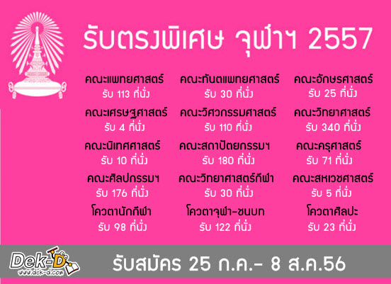 สวัสดีครับ รับตรงพิเศษ จุฬาฯ ปี 57 ทยอยออกระเบียบการมาทีละคณะแล้ว ล่าสุดเป็นคิวของ 3 คณะยอดฮิตอย่าง คณะวิทยาศาสตร์, คณะนิเทศศาสตร์ และหลักสูตรศิลปศาสตร์บัณฑิต สาขาวิชาการบริหารจัดการทรัพยากรการเกษตร จะมีรายละเอียดอย่างไร ไปติดตามกันเลยครับ