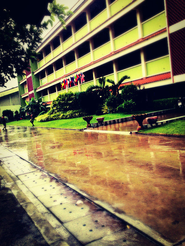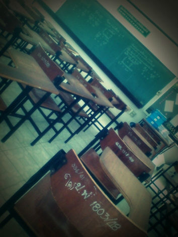 (10) สภาพห้องเรียน >> เป็นโต๊ะไม้สีคล้ำ สภาพโต๊ะก็จะมีรอยลิขวิดขีดๆ เขียนๆ บ้าง บางห้องก็เป็นห้องแอร์เช่น SEAR