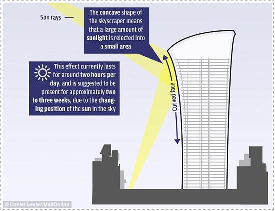 ส่วน ดร.ไซมอน ฟอสเตอร์ ศาสตราจารย์ฟิสิกส์ได้อธิบายเหตุการณ์นี้ว่า สาเหตุอาจเกิดจากตัวตึกมีลักษณะโค้งเว้าแบบเดียวกับกระจกรวมแสง ทำให้แสงอาทิตย์รวมกันที่จุดเดียว และสะสมพลังงานแสงได้มากเป็นพิเศษและกระจายออกสะท้อนไปยังบริเวณใกล้เคียง คล้ายกับหลักการการทดลองเรื่องแว่นขยายนั่นแหละค่ะ ต่างกันแค่ว่าถ้าตึกนี้โครงสร้างเป็นเลนส์นูน ก็จะทะลุเข้าไปไหม้ภายในอาคารเอง และจากที่ได้ตรวจสอบต้องตกใจหนักกว่าเดิมเมื่อพบว่าบนพื้นถนนจุดที่แสงสะท้อนตกกระทบลงมามีอุณหภูมิสูงถึง 92.6 องศาเซลเซียสเลยทีเดียวค่ะ