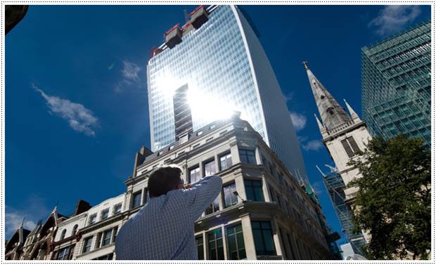 เมืองไทยมีโค้งอันตรายตามท้องถนน แต่ที่ลอนดอนนี่มีโค้งอันตรายติดมากับตึก บอกตรงๆ ว่าดูแค่รูปก็แสบตาแล้วค่ะ ถึงแม้ว่าเจ้าของตึกจะอ้างว่าตำแหน่งพระอาทิตย์จะทำมุมแค่วันละ 2 ชั่วโมง แต่มั่นใจว่าเป็น 2 ชั่วโมงที่ทำเอาคนรอบๆ เดือดร้อนกันเป็นแถบ ก็ไม่รู้ว่าหลังจากนี้ทีมวิศวกรจะแก้ไขปัญหานี้ยังไงต่อไป หรือจะต้องใช้ตาข่ายคลุมตึกในช่วงเวลานั้น??