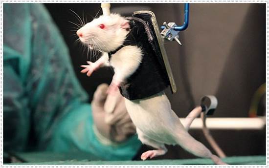 หนูในการทดลองฉีดค็อกเทลยา หลังจากนั้นพักฟื้นและกระตุ้นด้วยกระแสไฟฟ้าที่ส่งผ่านเสื้อกั๊กที่สวมอยู่ เพื่อรักษาอาการอัมพาต