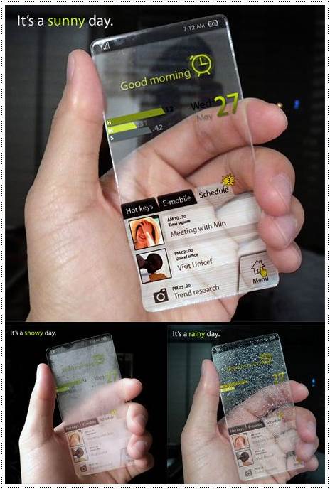 สมาร์ทโฟนสุดเก๋ที่ออกแบบโดย Seunghan Song มาพร้อมแนวคิดมือถือบอกสภาพอากาศ ตัวเครื่องมีลักษณะใสแจ๋ว หน้าจอโปร่ง เครื่องขนาดพอดีมือ เครื่องนี้จะบอกสภาพอากาศโดยการวัดสภาพอากาศ ณ ตอนนั้นๆ แล้วแสดงผลออกมาทางหน้าจอ อย่างในรูปตัวอย่างนี้ ถ้าอากาศปลอดโปร่ง หน้าจอก็จะปกติ หรือถ้าฝนตก ก็จะแสดงผลออกมาเป็นหยดน้ำนั่นเอง