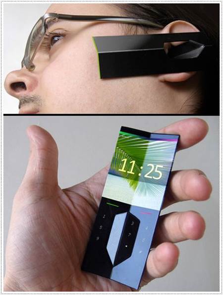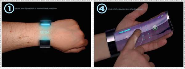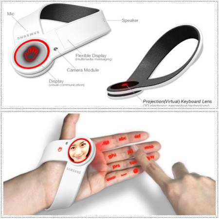 ไอเดียสุดแปลกที่จะเปลี่ยนนิ้วมือให้เป็นที่แสดงผลและแป้นพิมพ์ ใช้งานโดยการสวมโทรศัพท์ไว้ที่ข้อมือ บริเวณนิ้วมือก็จะกลายเป็น keypad ให้ได้จิ้มกันเลย ส่วนไมค์และหูฟังก็อยู่บนตัวเครื่องค่ะ