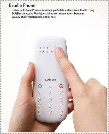 แม้ว่ามือถือบางรุ่นจะมีปุ่มสัญลักษณ์อยู่ตรงปุ่มตัวเลข แต่สำหรับผู้พิการทางสายตาแล้วการใช้งานก็ยังลำบากอยู่ดี เพราะการใช้งานอย่างอื่นยังทำได้ยาก ยิ่งสมาร์ทโฟนที่ใช้ระบบสัมผัสยิ่งไม่สามารถใช้ได่ ดังนั้นหากในอนาคตมีมือถือสำหรับผู้พิการทางสายตาขึ้นมาจริงๆ ก็คงมีประโยชน์มากเลยค่ะ อย่างเช่นแนวคิดของโทรศัพท์เครื่องนี้ ใช้เทคโนโลยี Electric Active Plastic (EAP) ที่สามารถแสดงผลเป็นอักษรเบรลได้บนตัวเครื่องพลาสติก เมื่อมีข้อความเข้ามาแค่สัมผัสผู้พิการก็สามารถอ่านข้อความเหล่านั้นได้แล้ว
