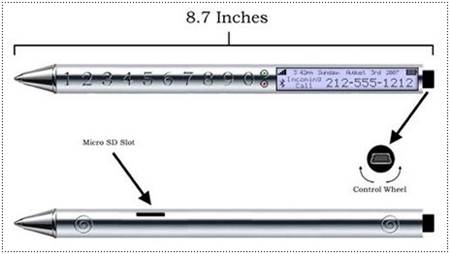 น้องๆ อาจจะเคยเห็นกล้องปากกากันไปแล้ว แต่ไอเดียมือถือสำหรับอนาคตก็มีรูปแบบปากกามือถือด้วย ซึ่งรูปร่างหน้าตาก็เหมือนปากกาทั่วไป มีความยาว 8.7 นิ้ว มีตัวเลขเรียง 1-9 และถัดไปเป็นจอแสดงผล และที่น่าทึ่งไปกว่านั้น ไม่น่าเชื่อว่าแท่งแค่นี้ มีช่องใส่ MicroSD card ด้วย ครบสูตรเล็กพริกขี้หนูจริงๆ แต่พี่มิ้นท์ว่าเล็กแบบนี้หายง่ายแน่เลย T^T