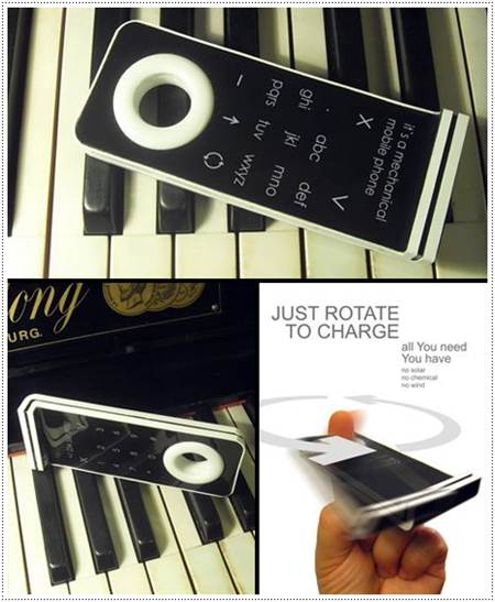 มือถือที่มีรูปทรงมีรูตรงกลางแบบนี้ไม่ได้ออกแบบขึ้นเพื่อความเก๋ไก๋เพียงอย่างเดียวนะคะ แต่แนวคิดการทำงานของเครื่องก็เก๋ไก๋ไม่แพ้กัน ปกติเวลาแบตจะหมดแล้วไม่มีสายชาร์จแบตน้องๆ ก็คงไม่กล้าเล่นต่อเพราะกลัวเครื่องดับใช่มั้ยคะ แต่สำหรับเครื่องนี้ชาร์จแบตได้ง่ายๆ ด้วยการเอานิ้วสวมที่รูวงกลมตัวเครื่องแล้วหมุนๆๆ แบตก็จะเพิ่มขึ้นแล้วค่ะ แถมหน้าจอยังบอกอีกด้วยว่าชาร์จได้กี่เปอร์เซ็นแล้ว เรียกว่าเป็นรุ่นที่ออกแบบมาสำหรับคนที่ใช้มือถือทั้งวันจริงๆ ผู้ออกแบบโทรศัพท์เครื่องนี้คือ Mikhail Stawsky ค่ะ