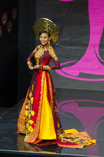 | “VIETNAM” ชุดประจำชาติเวียดนามที่ แสดงถึงวัฒนธรรมของชนชาติ ชุดที่เผยแพร่ก่อนการประกวดจริงเป็นชุดที่ได้แรงบันดาลใจจากชุดของชนเผ่าชาวเขา (ด้านบน) แต่ชุดที่ใช้จริงบนเวทีเป็นชุดที่แสดงเอกลักษณ์ของชุดเวียดนาม อาวหญ่าย (Ao Dai) ได้มากขึ้น |