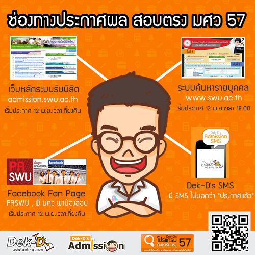 การดูผลในช่องทางนี้จะเป็นการดูแบบไฟล์ PDF เปิดมาเป็นคณะแล้วไล่รายชื่อของตนเอง โดยรายชื่อจะเรียงตามตัวอักษร โดยทางระบบได้ SET UP ข้อมูลให้ประกาศผลในเวลา 00.00 น.ของวันที่ 12 พ.ย.56 เป็นต้นไป เว็บไซต์คือ http://admission.swu.ac.th/