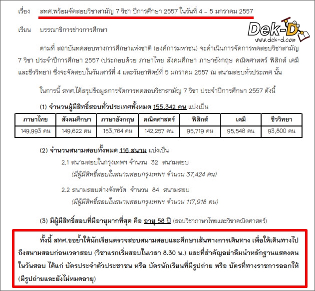 "อย่างไรก็ตาม ทปอ.หวังว่าช่วงจัดสอบ 7 วิชาสามัญไม่น่าจะมีปัญหาอะไรเกิด ขึ้นแต่ก็ขอให้นักเรียน และผู้ปกครองตรวจสอบข้อมูลต่างๆ ได้ทางเว็บไซต์ของ สทศ. รวมถึงศึกษาเส้นทาง และวางแผนการเดินทางล่วงหน้าด้วยเพื่อไม่ให้เกิดปัญหาขึ้น"