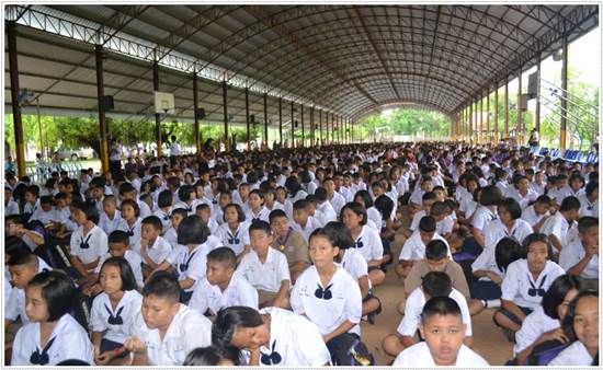 12.4 ในการเข้าแถวเข้าเคารพธงชาติ ทุกๆเช้า นักเรียนไม่ต้องกลัวร้อน กลัวฝน โรงเรียนเรามีโดมกันแดนกันฝน สามารถรองรับนักเรียนได้ถึง 4 พันคน