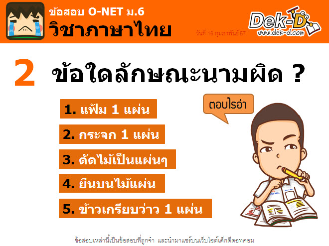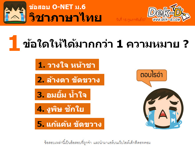 กลับจากสอบ O-NET ม.6 วิชาภาษาไทย (ก.พ.57) กันแล้ว เป็นอย่างไรกันบ้างครับ สติ สตางค์ ความมั่นใจ ยังอยู่ครบไหมเอ่ย.. วันนี้เพื่อเพิ่มความมั่นใจกับคำตอบที่ตอบไป พี่ลาเต้ ขอเปิดพื้นที่แบบกว้างๆ ให้น้องๆ มาคุยและแลกเปลี่ยนกันอย่างเต็มที่