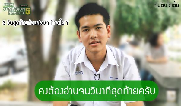 เหมือนกับ 4 กัปตัน BRAND'S Admission Reality 5 ทั้ง กัปตันไอซ์ กัปตันไวท์ กัปตันเบลล์ และกัปตันไตเติ้ล ที่แอบเสียวท้ายทอยตลอดเวลาที่อ่านหนังสือ ว่าจะทันหรือไม่ทันอย่างไร และก่อนไม่กี่วันที่จะสอบนี้ พี่แนนเลยขอไปสัมภาษณ์เช็คสถานะความพร้อมก่อนสอบ GAT PAT ของทั้ง 4 คนกันหน่อย ว่าใครพร้อมเก็บคะแนนเต็ม หรือใครหวังไปรอบหน้ากันบ้าง (เย้ยยยย)