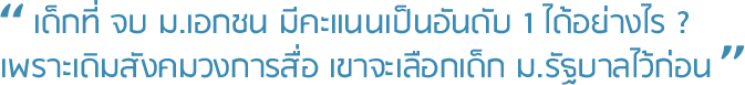- A : ชีวิตคนเราผ่านอะไรมาที่ไม่เหมือนกัน แต่เราสามารถมีปลายทางที่ดีเหมือนกันได้ พี่ขอพูดในส่วนของพี่ที่เป็นนักศึกษา ม.เอกชน นะ ตอนทำงานพี่ทำทุกอย่าง สั่งสมประสบการณ์ให้มากที่สุด และสิ่งที่พี่สัมผัสได้ และทำให้คนอื่นได้เห็นนั้นก็คือ พี่ได้ทำทุกอย่างที่อยากทำ ได้เรียนรู้ว่าเด็กที่จบมหาวิทยาลัยเอกชนก็สามารถทำงานได้ไม่แตกต่างจากเด็กที่จบจากมหาวิทยาลัยรัฐ ดังนั้นไม่ว่าน้องๆ จะเรียนที่ไหน ขอให้ตั้งใจ ความมุ่งมั่นจะทำให้เราประสบความสำเร็จตามที่เราตั้งใจไว้ค่ะ สู้ๆ