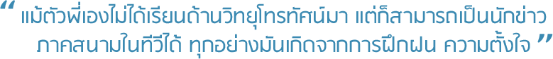 - A : พี่เรียนวารสารฯ มาก็ถือว่าตรงกับงานที่ทำนะ เพราะวารสารศาสตร์ จะสอนด้านข่าว การเขียนข่าว การกำหนดประเด็นข่าว แม้ว่าเราจะมาทำงานทีวีก็ตาม แต่ก็เป็นงานในทีวี การเรียนวารสารฯ มีประโยชน์มากสำหรับการทำข่าว เพราะว่าอย่างน้อยก็ทำให้จับประเด็นได้ดี สามารถรู้แนวทางในการติดตามแหล่งข่าว และก็เชื่อมโยงประเด็นได้ค่อยข้างดี และตรง จริงๆ อาจจะไม่ต้องเรียนวารสารฯ ก็ทำได้ แต่ก็จะแตกต่างตามความรู้พื้นฐานที่มี เพราะว่าการเขียนข่าวมันอยู่ที่ทักษะในการฝึกฝน และประสบการณ์มากกว่า มองกลับกับแม้ตัวพี่เองไม่ได้เรียนด้านวิทยุโทรทัศน์มา แต่ก็สามารถเป็นนักข่าวภาคสนามในทีวีได้ ทุกอย่างมันเกิดจากการฝึกฝน ความตั้งใจ และความมุ่งมั่นที่เราจะทำมันค่ะ