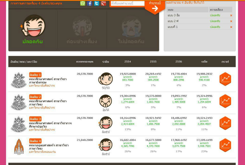 1.ไปที่โปรแกรมคำนวณคะแนนแอดมิชชั่นให้ติดชัวร์เว็บ Dek-D ในฟังก์ชั่น "เช็คความเสี่ยง 4 อันดับ" จากนั้นลุยคำนวณหาคณะที่ใช่ มหาลัยที่ชอบ เข้าใช้โปรแกรมคำนวณ คลิกที่นี่