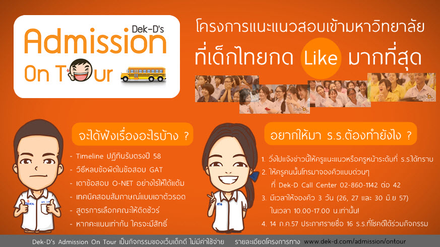 ให้อาจารย์แนะแนวหรือหัวหน้าระดับ โทรศัพท์มาจองคิวกับพี่ๆ Dek-D ทางโทรศัพท์ 02-860-1142 ต่อ 42 ตั้งแต่ในวันที่ 26 - 30 มิ.ย. เวลา 10.00 - 17.00 น. โดยจะมีพี่ๆ ทีมงานแอดมิชชั่นออนทัวร์ รอรับสายอยู่ (หากครบโควตาจะปิดรับทันที) ปล.กิจกรรมนี้ฟรี! ไม่มีค่าใช้จ่ายใดๆ และทางโครงการขอให้โอกาสส่วนใหญ่กับ ร.ร. ที่ไม่เคยร่วมกิจกรรมในซีซั่นที่ผ่านมา จากนั้นในวันจันทร์ที่ 14 ก.ค.57 ทางทีมงานจะประกาศรายชื่อโรงเรียนตัวจริงที่ได้เข้าร่วมกิจกรรม ซีซั่นนี้รับ 32 ร.ร. (แบ่งเทอมละ 16 ร.ร.)