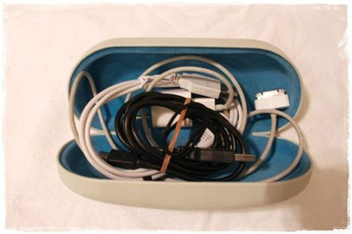 เก็บพวกสายปลั๊กไฟต่างๆ ที่จะพกไปด้วย เช่น สายชาร์จกล้องถ่ายรูป สายชาร์จโทรศัพท์มือถือ ไว้ในกล่องใส่แว่นที่ไม่ใช่แล้ว จะได้ไม่พันรกรุงรัง