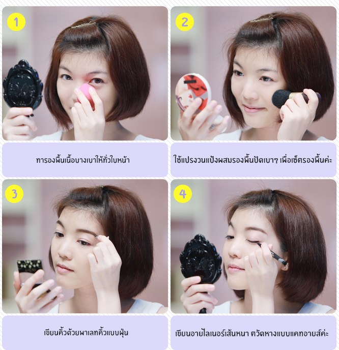 เติมแป้ง เขียนคิ้วและใช้มาสคาร่าคิ้ว ใช้ครีมบลัชที่ทนกว่าแบบฝุ่น