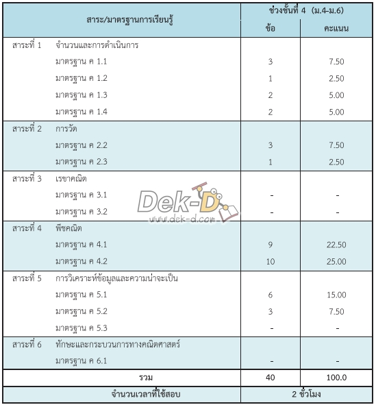 - 40 ข้อเป็นปรนัย 5 ตัวเลือก 32 ข้อ และเป็นแบบระบายคำตอบค่าตัวเลข 8 ข้อ