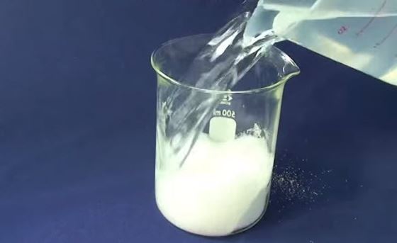 จากนั้น เตรียมน้ำไว้และค่อยๆ เทใส่ลงในถ้วยโซเดียมโพลิอะคริเลต ผงหิมะเทียมก็จะค่อยๆ ขยายตัว ฟูขึ้นจนกลายเป็นผงหิมะสีขาว แต่หิมะเทียมนี้จะไม่เย็นนะคะ ถ้าอยากให้เย็นสามารถใส่น้ำเย็นลงไปได้