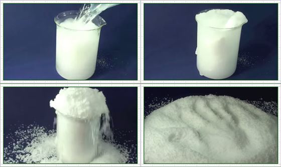 เหตุผลที่ทำให้ผงชนิดนี้แปลงสภาพจากผงๆ เป็นหิมะเทียมได้นั้น เป็นเพราะว่าสารโซเดียมโพลิอะคริเลต ที่มีคุณสมบัติพิเศษ สามารถซึบซับน้ำได้ประมาณ 200-300 เท่าของน้ำหนักตัว ทำการดูดซับน้ำที่เราเทลงไป ทำให้ผงเล็กๆ มีขนาดใหญ่ขึ้น เป็นเกล็ดคล้ายเกล็ดหิมะนั่นเอง ใครอยากสร้างหิมะไว้ในบ้าน ก็ลองหาซื้อมาเล่นกันได้นะคะ