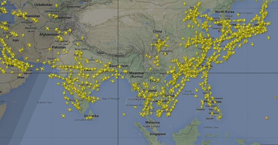 เมืองใหญ่ๆ การจราจรทางอากาศหนาแน่นมากๆ จากภาพที่เห็น นี่คือบริเวณ USA ค่ะ บินกันนัวเนียมาก หลายคนคงสงสัยว่าเครื่องบินเยอะขนาดนี้มีชนกันบ้างหรือเปล่า ขอตอบว่าไม่ชนแน่นอนค่ะ เพราะถ้าซูมออกมาระยะไกลๆ เครื่องบินแต่ละลำจะมีระยะบินห่างกันพอประมาณ นอกจากนี้ ATC ยังกำหนดเพดานบินและระยะห่างการบิน ไม่ให้ใกล้กันแน่นอน