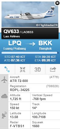จิ้มมาที่ลำนี้ค่ะ เป็นสายการบิน Lao Airlines เที่ยวบิน QV633 บินจากหลวงพระบางมากรุงเทพฯ ถ้ากลัวสับสนกับลำอื่น สามารถกดสัญลักษณ์เส้นหยักด้านซ้ายมือเพื่อให้แสดงผลแค่สายการบินที่เลือกก็ได้