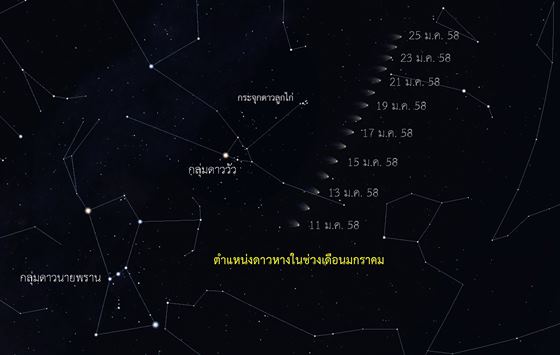 ตลอดทั้งเดือนมกราคม จะเริ่มสังเกตดาวหางได้ตั้งแต่ 19.00 น. ทางทิศตะวันออก ในแต่ละวันดาวหางจะเปลี่ยนแปลงระยะทางเพียงเล็กน้อย โดยจะเคลื่อนที่ผ่านกลุ่มดาววัว กลุ่มดาวแกะ และกลุ่มดาวสามเหลี่ยม และหลังจากดาวหางโคจรผ่านจุดใกล้ดวงอาทิตย์ที่สุดในวันที่ 30 ม.ค. ความสว่างของดาวหางจะจางลงเล็กน้อยค่ะ มีผลทำให้สังเกตดางหางได้ยากขึ้น ส่วนเดือนกุมภาพันธ์ดาวหางเลิฟจอย จะอยู่ระหว่างกาแล็กซีแอนโดรเมดากับกลุ่มดาวเพอร์เซอุส และจะค่อยๆ หายไปในปลายเดือนพฤษภาคม