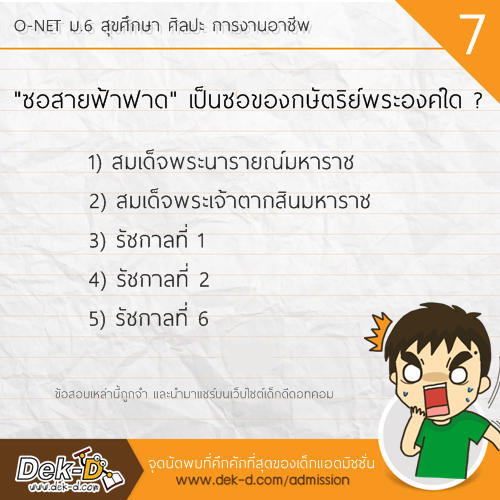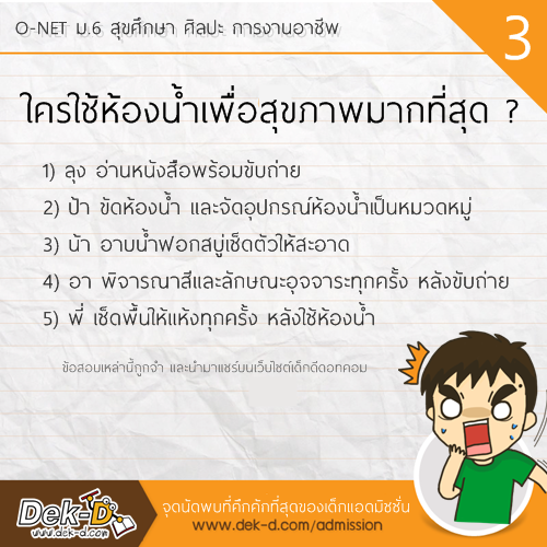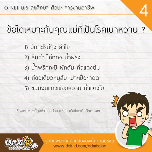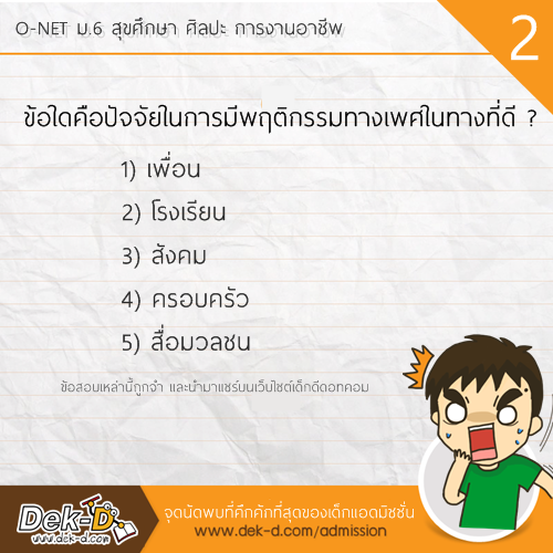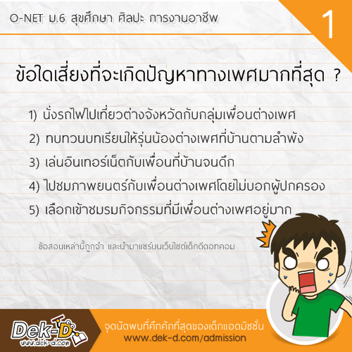 สวัสดีครับ เรียกว่าเป็นวิชาที่ตั้งตารอเลยครับ สำหรับ O-NET ม.6 วิชาสุขศึกษา ศิลปะ การงานอาชีพ เพราะหลังจากแต่ละปีที่ผ่านมา มักจะมีข้อสอบออกมาสร้างสีสันให้พูดถึงกันทั้งประเทศ อาทิ เมื่อมีอารมณ์ทางเพศต้องไปเตะบอล หรือ คุณแม่มาทานผัดไทยที่บ้าน เราจะต้องปูโต๊ะอาหารด้วยผ้าสีอะไร ล่าสุดในการสอบ O-NET ของปีนี้ ก็มีบางข้อที่เป็นสีสัน วันนี้ พี่ลาเต้ รวบรวมมาให้แล้วครับ ไปดูกันเลย