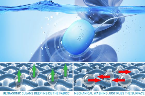 อุปกรณ์ซักผ้าชิ้นนี้มีชื่อว่า Dolfi พัฒนาโดยทีมวิศวกรจาก MPI Ultrasonic ประเทศสวิตเซอร์แลนด์ มีวัตถุประสงค์เพื่อช่วยทำความสะอาดบนเนื้อผ้าที่ทำความสะอาดได้ยากหรือชำรุดง่าย เช่น ผ้าไหม แคชเมียร์ เป็นต้น และยังออกแบบมาให้ใช้งานง่าย ประหยัดเวลาอีกด้วย ขั้นตอนการทำงานก็ไม่ได้ยุ่งยากหรืออันตรายอะไรเลยค่ะ แค่เตรียมเสื้อผ้าลงในกะละมังแช่น้ำ หรือ อ่างซักล้าง จากนั้นใส่ผงซักฟอกลงไป ตามด้วยเครื่องนี้ และเปิดใช้งานค่ะ เท่านี้เครื่องก็จะทำหน้าที่ของมันอย่างเพอร์เฟคสุดๆ ใช้เวลาแค่ 30 นาที ก็จะได้เสื้อสะอาดๆ ใส่แล้วค่ะ