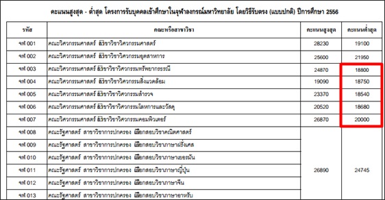 - ส่วนสาขาที่คนกลัวมากที่สุด ตกเป็นของ "วิศวกรรมคอมพิวเตอร์" ด้วยสาเหตุคะแนนต่ำสุดปี 56 อยู่ที่ 20,000 คะแนน ซึ่งสูงที่สุดเมื่อเทียบกับทุกสาขา