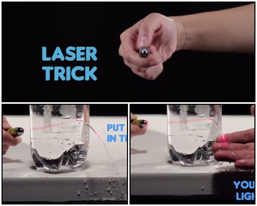 ให้น้องๆ เตรียมขวดใส่น้ำไว้ และเจาะรูด้านข้างขวด จากนั้นให้ใช้ปากกาเลเซอร์หรือไฟฉายส่องไปด้านหลังให้ตรงกับรูที่เจาะไว้ จะเห็นว่าแสงสามารถทะลุออกมาพร้อมกับน้ำที่โค้งได้ และถ้าเอามือมารองรับปลายน้ำ แสงเลเซอร์ก็จะตกที่มือของเราด้วย