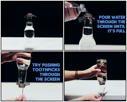 การทดลองนี้เป็นมายากลที่เล่นกันแพร่หลายมากๆ น้องๆ อาจจะเคยเห็นแล้ว คราวนี้มาลองทำด้วยตัวเองก็ได้นะ วิธีการคือ ใช้ตาข่ายมาครอบปากขวดและหาหนังยางมัดไว้ เติมน้ำให้เต็ม ใช้มือปิดฝาขวดให้สนิท ค่อยๆ คว่ำขวดค่ะ ผลที่ได้คือ น้ำจะไม่ไหลออกมา ยังสามารถใช้ไม้จิ้มฟันทิ่มเข้าไปได้อีกด้วย