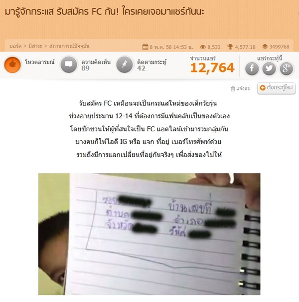 ส่วนเด็กที่ไปเป็น FC เด็กคนอื่นอาจมองว่าเป็นเรื่องสนุก ได้คุยกับเพื่อนใหม่ๆ เหมือนกลุ่มเพื่อนที่โรงเรียนนี่แหละ ได้มีกลุ่มที่พูดคุยเรื่องที่สนใจเหมือนๆ กัน แม้ว่ามันดูประหลาด ในมุมผู้ใหญ่แล้ว แต่มองว่าเป็นกิจกรรมรูปแบบหนึ่งก็ได้ค่ะ และคอยมองให้เหมาะสม คอยสังเกตและบอกลูกหลานพี่น้องตัวเองให้ไม่ไปพูดคุยเปิดเผยชื่อจริง นามสกุลจริง ที่อยู่อย่างไม่มั่นใจ ให้ระวังมิจฉาชีพ ระวังโดนลักพาตัว อย่าตามไปคุยในที่ลับ ไม่ว่าชายหรือหญิง
